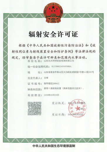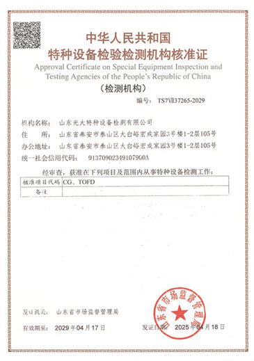 山東光大特種設(shè)備檢測(cè)有限公司是經(jīng)山東省市場(chǎng)監(jiān)督管理局核準(zhǔn)的甲類B1特種設(shè)備綜合檢驗(yàn)機(jī)構(gòu)。2017年9月30日取得了山東省市場(chǎng)監(jiān)督管理局頒發(fā)的《檢驗(yàn)檢測(cè)機(jī)構(gòu)資質(zhì)認(rèn)定證書》。2018年2月22日取得了山東省市場(chǎng)監(jiān)督管理局頒發(fā)的《特種設(shè)備檢驗(yàn)檢測(cè)機(jī)構(gòu)核準(zhǔn)證》(起重機(jī)械)檢驗(yàn)檢測(cè)資質(zhì)。2021年11月取得山東省市場(chǎng)監(jiān)督管理局版發(fā)的《特種設(shè)備檢驗(yàn)檢測(cè)機(jī)構(gòu)核準(zhǔn)證》(安全閥在線、離線)校驗(yàn)資質(zhì)。2023年11月取得山東省市場(chǎng)監(jiān)督管理局頒發(fā)的甲類檢驗(yàn)機(jī)構(gòu)B1《特種設(shè)備檢驗(yàn)檢測(cè)機(jī)構(gòu)核準(zhǔn)證》,具有壓力容器(RD2...
